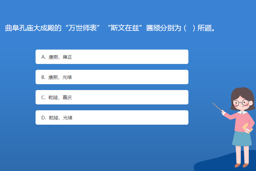 科普星空体育官网入口网站問答:曲阜孔廟大成殿的“萬世師表”“斯文在茲”匾額分別為( )所題。
