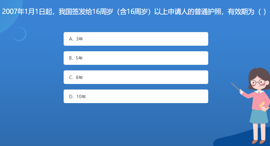 科普星空体育官网入口网站問答:2007年1月1日起,我國簽發給16周歲(含16周歲)以上申請人的普通護照,有效期為( )