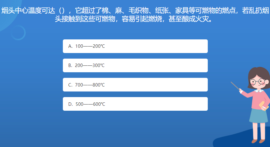 科普星空体育官网入口网站問答:煙頭中心溫度可達(),它超過了棉、麻、毛織物、紙張、家具等可燃物的燃點,若亂扔煙頭接觸到這些可燃物,容易引起燃燒,甚至釀成火災。