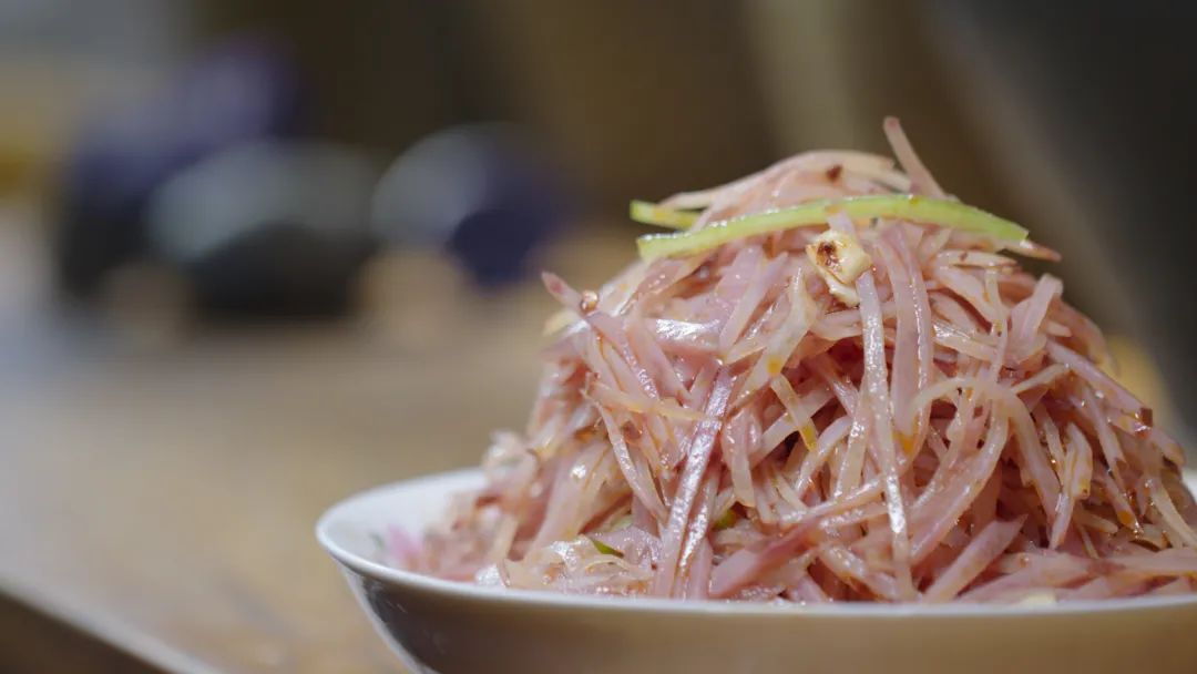 左圖為(wei) 拌粉色土豆,右圖為(wei) 洋芋攪團