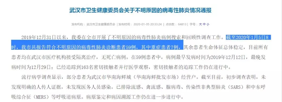 2019年12月31日,武漢市衛健委在官網首次發布肺炎疫情的通報情況: