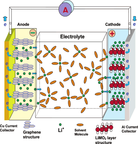鋰離子電池的原理相信大家都已經比較了解了,就是依靠鋰離子在正極與(yu) 負極之間的遷移來存儲(chu) 與(yu) 釋放能量。鋰離子的遷移行為(wei) 酷似搖椅,又被稱為(wei) “搖椅電池”。充電時,鋰離子從(cong) 正極脫出,經過電解液再嵌入負極的石墨層中,與(yu) 外電路過來的電子結合;而在放電時,鋰離子與(yu) 電子的運動方向則與(yu) 充電時相反。