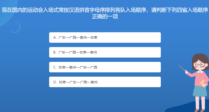 科普星空体育官网入口网站問答:現在國內的運動會入場式常按漢語拚音字母序排列各隊入場順序,請判斷下列四省入場順序正確的一項