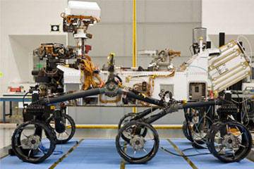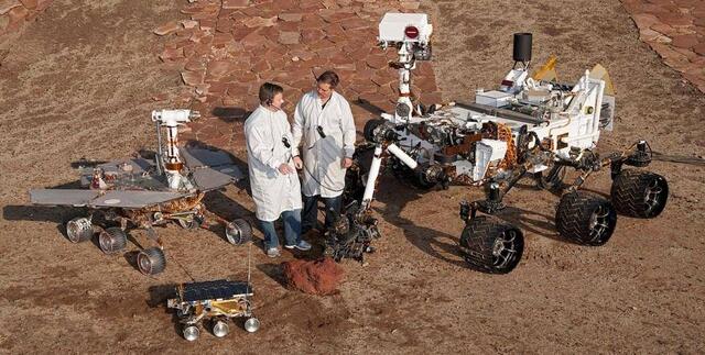 火星科學實驗室,又名“好奇號”,占據了火星探測器陳列室的主要位置,它打破了美國宇航局的“勇氣號”和“機遇號”在2003年創下的記錄,長度是它們(men) 的兩(liang) 倍(約10英尺或3米),重量是它們(men) 5倍(1982磅或899公斤)。它是越野的,沒有輪轂來鎖定(也沒有人來鎖定他們(men) )。6個(ge) 20英寸(51厘米)的鋁輪可越過接近30英寸(75厘米)高的障礙物,每天可在火星地形上前進660英尺(200米)。