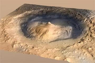 圖解:這是好奇號著陸的蓋爾隕石坑(Gale Crater)。注意,這個(ge) 藝術概念圖有垂直方向上的誇大,為(wei) 了讓人們(men) 更好地了解該地區的地形。