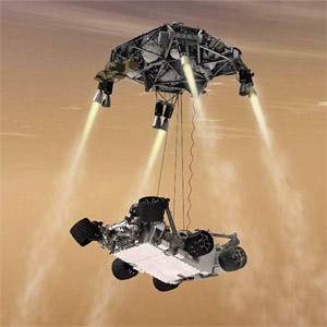 火星車的上層像龜殼一樣被夾在背後,完全脫離了圓錐體(ti) 。過了一會(hui) 兒(er) ,安裝在火箭輪輞上的製動火箭爆炸了,把火箭和探測器固定在離地66英尺(20米)高的地方;從(cong) 這裏,上麵的舞台就像天空中的仙鶴,將好奇號像蛛絲(si) 上的蜘蛛一樣降下。一旦探測器安全著陸,它的纜繩就被割斷,好奇號就開始了它的旅程。
