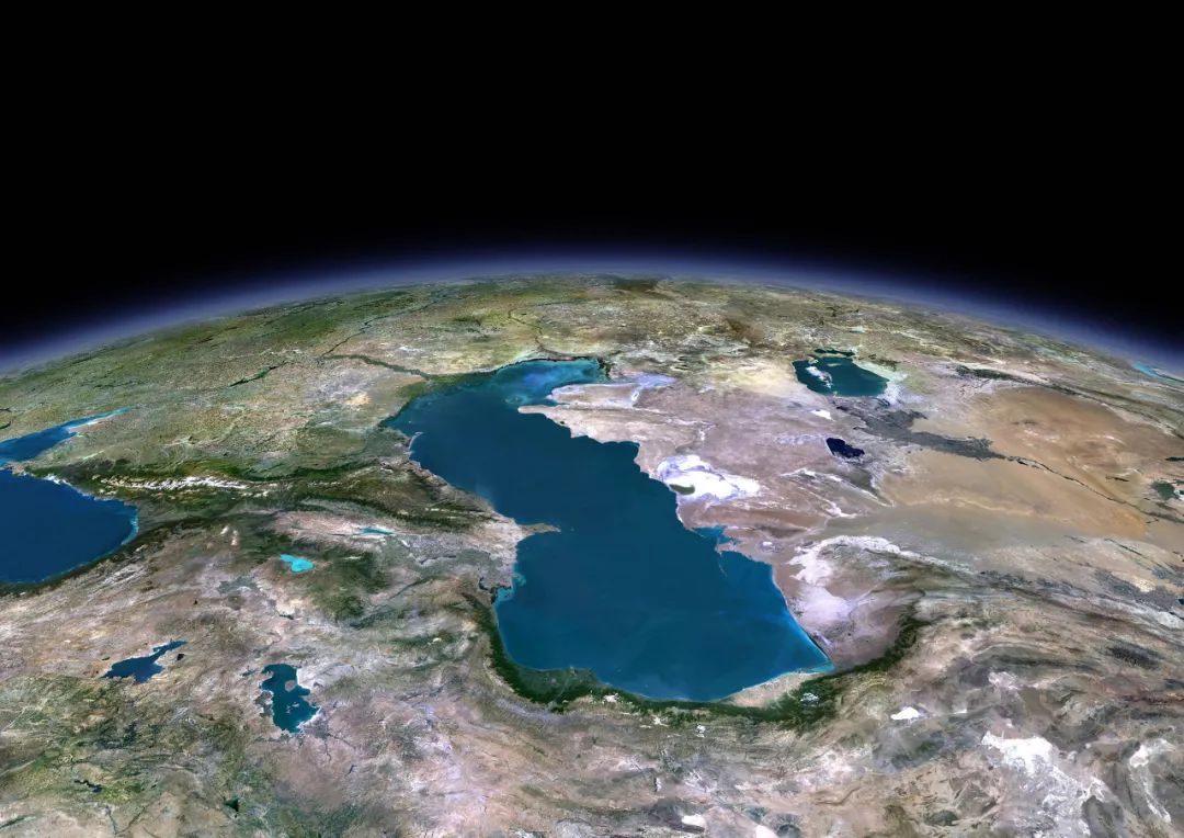 黑海和裏海 | 副特提斯海從(cong) 塔裏木盆地向西退卻的過程中,窪地裏的海水保留下來。後來,周圍河流繼續注入,這些窪地演化成黑海(左側(ce) )和裏海(中部)。類似的過程曾經也在塔裏木盆地發生過。圖源@VCG