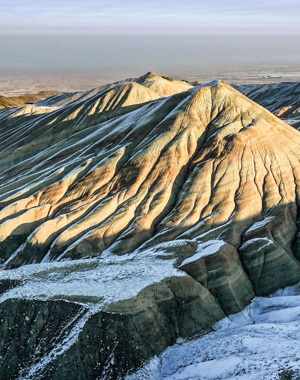 塔克拉瑪幹沙漠西南方向的麻紮塔格山 | 此山南側(ce) 發白,北側(ce) 發紅,因此也叫作紅白山。這些地層中隱藏著700萬(wan) 年前塔裏木盆地內(nei) 最古老沙丘的身影。遠景是塔克拉瑪幹沙漠西南部。圖源@圖蟲創意