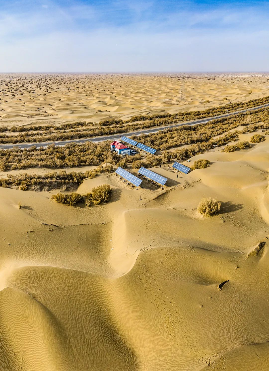 巴音郭楞州南部且末縣某村莊的分布式光伏發電設備 | 太陽能發電板安裝在村民的房頂上,平時發電自用,閑時餘(yu) 電入網,可以為(wei) 村民創收。圖源@VCG就這樣,那些曾拋棄了塔裏木荒涼腹地的人們(men) ,又憑借著工業(ye) 的力量,重新走進了荒涼。但這並不意味著人們(men) 要試著征服或消滅沙漠,而隻是運用科技的力量,合理利用沙漠。