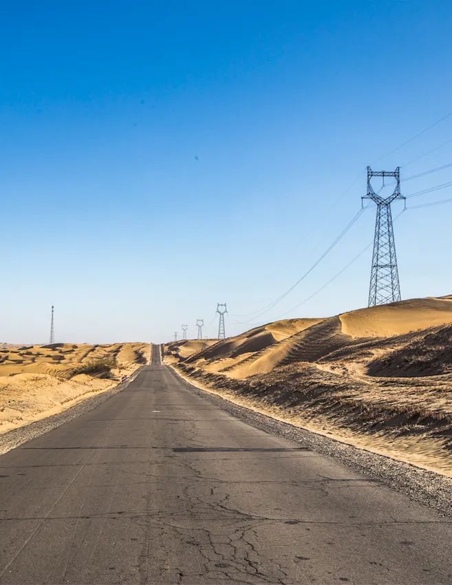 塔克拉瑪幹沙漠裏的公路和輸電塔 | 公路和電力,引領文明走進沙漠。攝影師@王寰