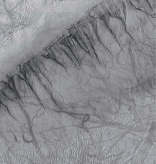 衝(chong) 溝,這是火星上最有爭(zheng) 議的水流地貌,具有小型、線性的年輕侵蝕特征,並切入到陡坡之中。衝(chong) 溝的寬度為(wei) 幾米到幾十米,長度上百米,要比網狀河穀小得多。它們(men) 大多分布在南半球中緯度地區的陡立斜坡上,表麵無撞擊坑分布或撞擊坑較少,因此推測其形成時期相對較晚。