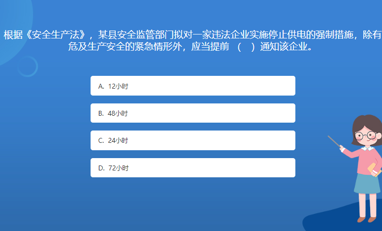 科普基地星空体育官网入口网站問答:根據《安全生產法》,某縣安全監管部門擬對一家違法企業實施停止供電的強製措施,除有危及生產安全的緊急情形外,應當提前 ( )通知該企業。