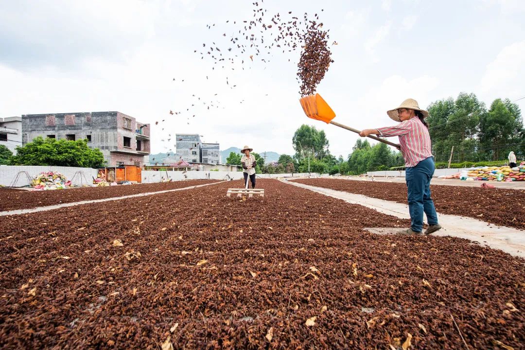 上圖即為(wei) 廣西藤縣村民趁天氣晴好,曬收八角