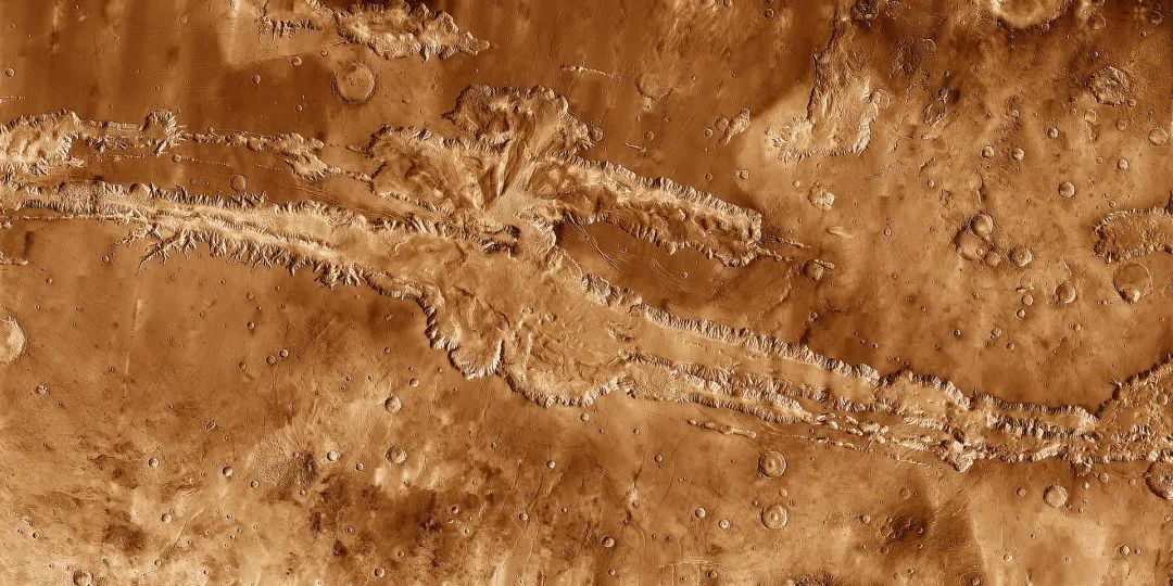 圖注:火星上的“水手峽穀”,袁安行所在的暗夜穀地,就在圖片最左邊。然而人類,正在快速地改造這裏。袁安行逆著當年的河道,從(cong) 暗夜穀底出發登山。一路上有很多的車轍印——實際上暗夜叉穀的兩(liang) 邊,已經豎起了大量高聳入雲(yun) 的煙囪。定睛細看,才能發現這些煙囪再向外噴湧無色的氣體(ti) 。