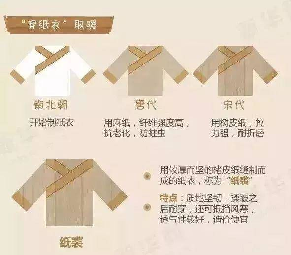 這一時期,出現了禦寒、耐穿且特意加厚的紙衣,叫做“紙裘”。唐代的紙衣取材於(yu) 麻紙,它的纖維強度高,既抗老化,又能防蟲;宋代改成用楮皮紙製作,紙裘變得更加耐磨,不僅(jin) 可以抵禦風寒,透氣性還好,造價(jia) 也十分便宜。於(yu) 是,迫於(yu) 饑寒,文人、士兵、小吏以及僧侶(lv) 紛紛穿上“紙裘”禦寒。宋代就有一位隱居在王屋山的王姓居士,因為(wei) 常穿紙裘,被人戲稱為(wei) “王紙襖先生”。
