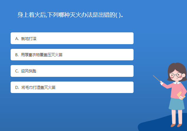 科普基地星空体育官网入口网站問答:身上著火後,下列哪種滅火辦法是出錯的( )。