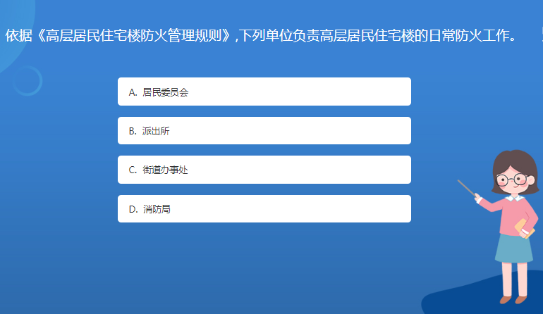 科普基地星空体育官网入口网站問答:依據《高層居民住宅樓防火管理規則》,下列單位負責高層居民住宅樓的日常防火工作。