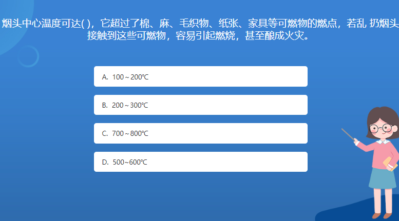 科普基地星空体育官网入口网站問答:煙頭中心溫度可達( ),它超過了棉、麻、毛織物、紙張、家具等可燃物的燃點,若亂 扔煙頭接觸到這些可燃物,容易引起燃燒,甚至釀成火災。
