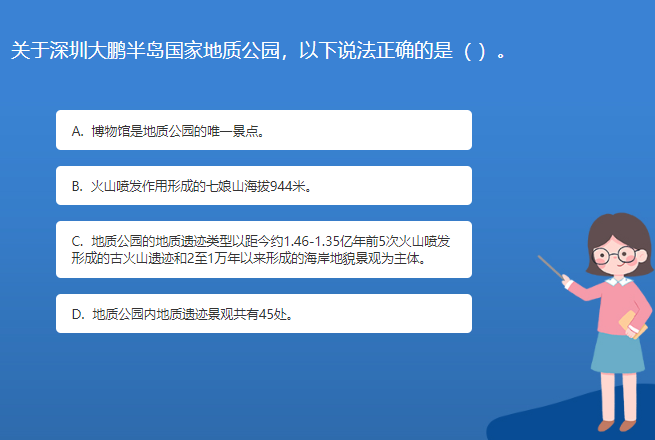 科普基地星空体育官网入口网站問答:關於深圳大鵬半島國家地質公園,以下說法正確的是( )。