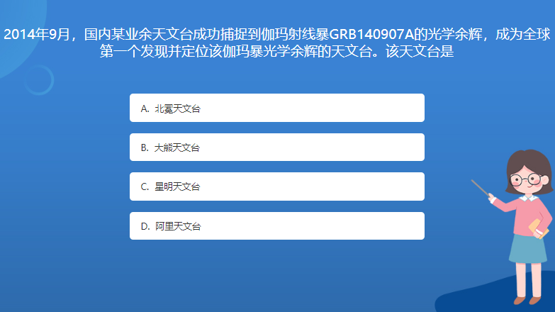 天文星空体育官网入口网站問答:2014年9月,國內某業餘天文台成功捕捉到伽瑪射線暴GRB140907A的光學餘輝,成為全球第一個發現並定位該伽瑪暴光學餘輝的天文台。該天文台是