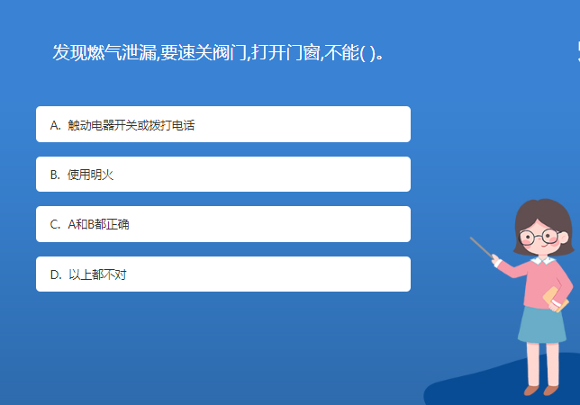 科普基地星空体育官网入口网站問答:發現燃氣泄漏,要速關閥門,打開門窗,不能( )。