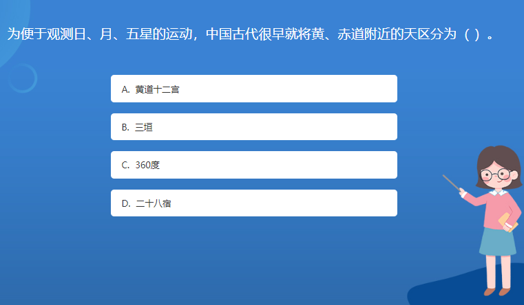天文星空体育官网入口网站問答:為便於觀測日、月、五星的運動,中國古代很早就將黃、赤道附近的天區分為( )。