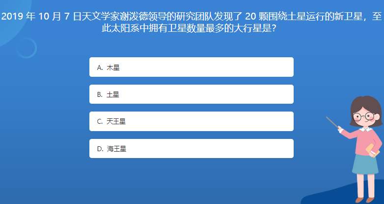 天文星空体育官网入口网站問答:2019 年 10 月 7 日天文學家謝潑德領導的研究團隊發現了 20 顆圍繞土星運行的新衛星,至此太陽係中擁有衛星數量最多的大行星是?
