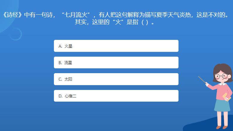 天文星空体育官网入口网站問答:《詩經》中有一句詩,“七月流火”,有人把這句解釋為描寫夏季天氣炎熱,這是不對的。其實,這裏的“火”是指( )。