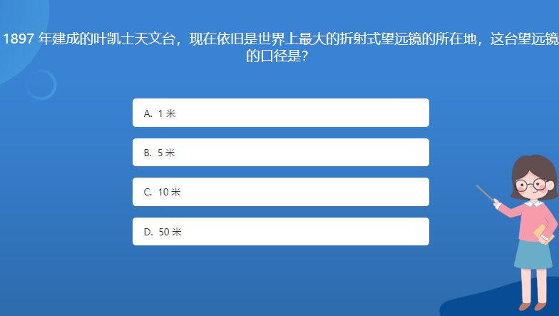 天文星空体育官网入口网站問答:1897 年建成的葉凱士天文台,現在依舊是世界上最大的折射式望遠鏡的所在地,這台望遠鏡的口徑是?