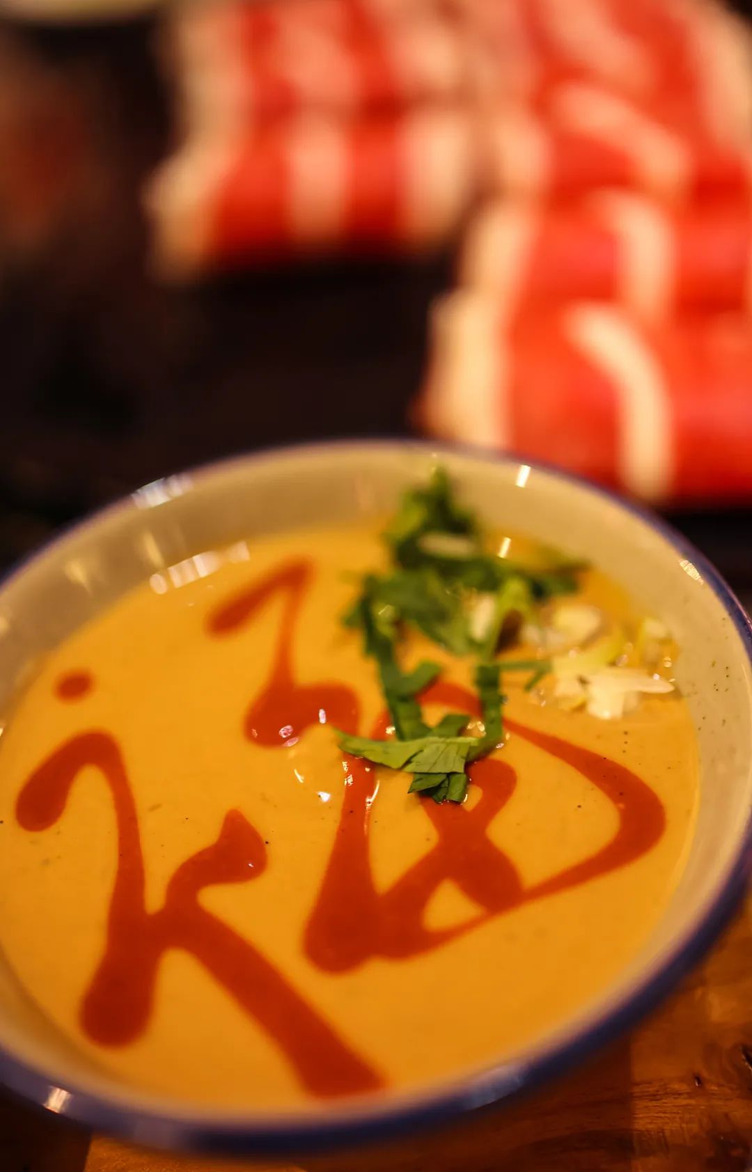 即用兔肉片在風爐滾水中擺熟、蘸料食用
