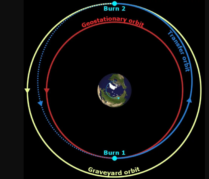該組織指定,地球同步衛星衛星壽命終結時,應該被推進到同步軌道環上空300公裏處的“墳場軌道”。