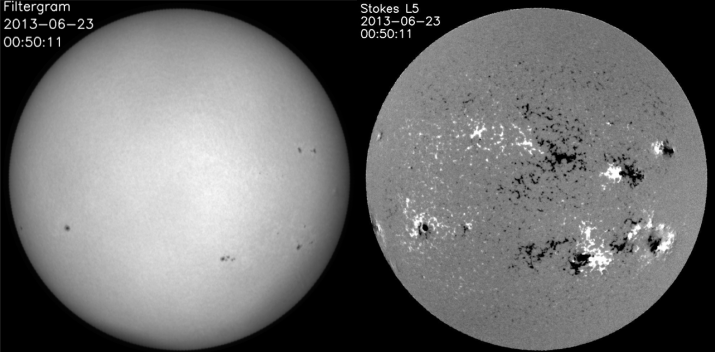 太陽磁場是如何產(chan) 生和演化的? 在討論這個(ge) 問題之前,我們(men) 首先來了解一下太陽表麵磁場的長期演化規律。早在19世紀中葉,德國天文愛好者施瓦貝(Samuel Heinrich Schwabe)便發現太陽黑子數以大約11年為(wei) 周期發生變化。黑子喜歡成群結隊地出現,出現後又喜歡“拉幫結派”,導致大多數黑子群中的黑子通常聚集為(wei) 兩(liang) 簇:一簇靠西,一簇靠東(dong) 。前者稱為(wei) 前導黑子,後者則叫後隨黑子。 20世紀初,海爾發現,前導和後隨黑子的磁場極性往往相反,這種極性分布在南北半球相反(圖3),並且在下一個(ge) 黑子周變換極性。實際上,黑子群的磁場結構大體(ti) 上沿東(dong) 西方向分布,我們(men) 也稱為(wei) 環向磁場。圖3 懷柔太陽觀測基地全日麵磁場望遠鏡拍攝的光球像(左圖)和光球視向磁場圖像(右圖,黑色和白色表示不同極性)。圖片由國家天文台白先勇提供。
