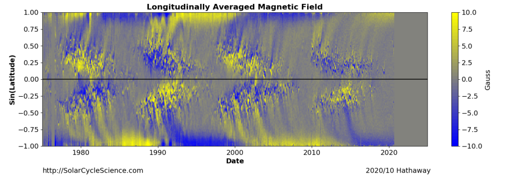 圖4 太陽磁場(徑向分量)的緯度分布隨時間的變化。藍色和黃色表示不同極性(圖片來源:https://solarcyclescience.com/solarcycle.html)。