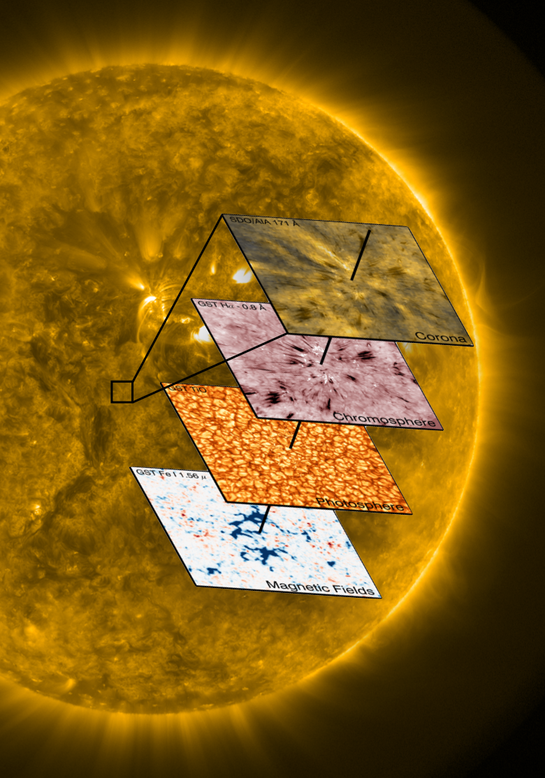 圖8 GST望遠鏡和SDO衛星對太陽大氣不同層次的協同觀測結果[6]。背景為(wei) SDO拍攝的日冕圖像,黑色正方形代表GST的觀測區域。層疊圖從(cong) 下往上分別是光球視向磁場、光球輻射、色球輻射和日冕輻射圖。顏色均為(wei) 偽(wei) 彩色。
