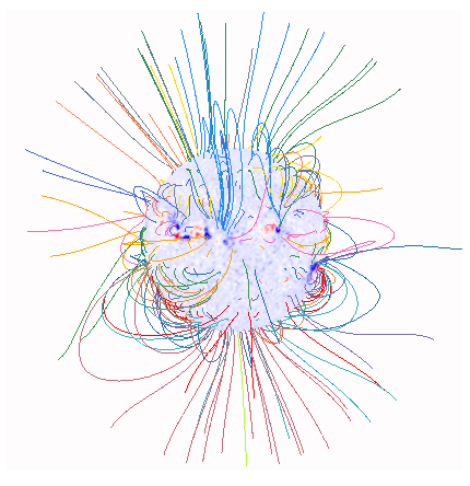 圖9 根據模型計算得到的太陽三維磁場結構[9]。不同顏色的線代表磁力線,中間為(wei) 光球磁場在視線方向上的分量分布圖,紅色和藍色代表不同極性。