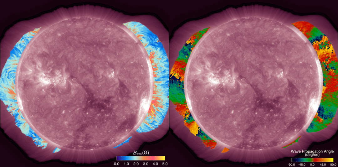 圖10 CoMP觀測的日冕磁場(垂直於(yu) 視線方向的分量)強度(左)和方向(右)分布圖疊加在SDO衛星拍攝的日冕圖像上[8,9]。