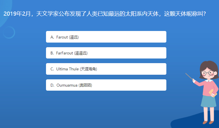天文星空体育官网入口网站問答:2019年2月,天文學家公布發現了人類已知最遠的太陽係內天體,這顆天體昵稱叫?