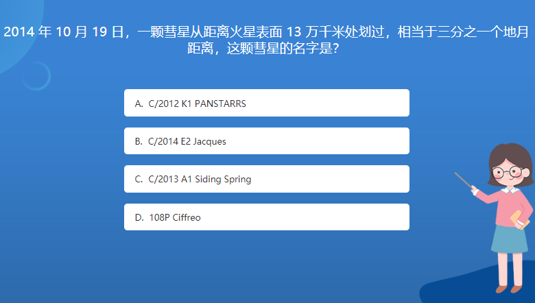 天文星空体育官网入口网站問答:2014 年 10 月 19 日,一顆彗星從距離火星表麵 13 萬千米處劃過,相當於三分之一個地月距離,這顆彗星的名字是?
