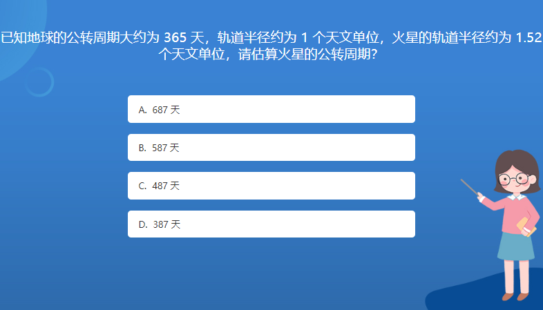 天文星空体育官网入口网站問答:已知地球的公轉周期大約為 365 天,軌道半徑約為 1 個天文單位,火星的軌道半徑約為 1.52 個天文單位,請估算火星的公轉周期?