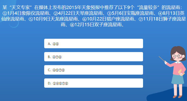 天文星空体育官网入口网站問答:某“天文專家”在媒體上發布的2015年天象預報中推薦了以下9個“流量較多”的流星雨:①1月4日象限儀流星雨②4月22日天琴座流星雨③5月6日寶瓶座流星雨④8月13日英仙座流星雨⑤10月9日天龍座流星雨⑥10月22日獵戶座流星雨⑦11月18日獅子座流星雨⑧12月15日雙子座流星雨