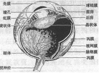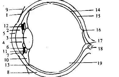 1.角膜緣2.前房 3.晶狀體(ti) 4.瞳孔 5.角膜 6.虹膜 7.前房角8.鞏膜 9.球結膜 10.睫狀體(ti) 11.後房 12.晶狀體(ti) 懸韌帶 13.距齒緣 14.視網 膜 15.脈絡膜 16.黃斑 17.視神經乳頭 18.視神經 19.玻璃體(ti)