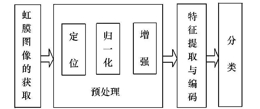 虹膜識別通過對比虹膜圖像特征之間的相似性來確定人們(men) 的身份,其核心是使用模式識別、圖像處理等方法對人眼睛的虹膜特征進行描述和匹配,從(cong) 而實現自動的個(ge) 人身份認證。虹膜識別的主要步驟包括虹膜圖像的獲取、預處理、特征提取與(yu) 編碼和分類。