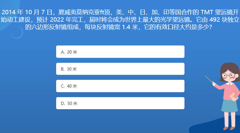 天文星空体育官网入口网站問答:2014 年 10 月 7 日,夏威夷莫納克亞ft頂,美、中、日、加、印等國合作的 TMT 望遠鏡開始動工建設,預計 2022 年完工,屆時將會成為世界上最大的光學望遠鏡。它由 492 塊獨立的六邊形反射鏡組成,每塊反射鏡寬 1.4 米,它的有效口徑大約是多少?