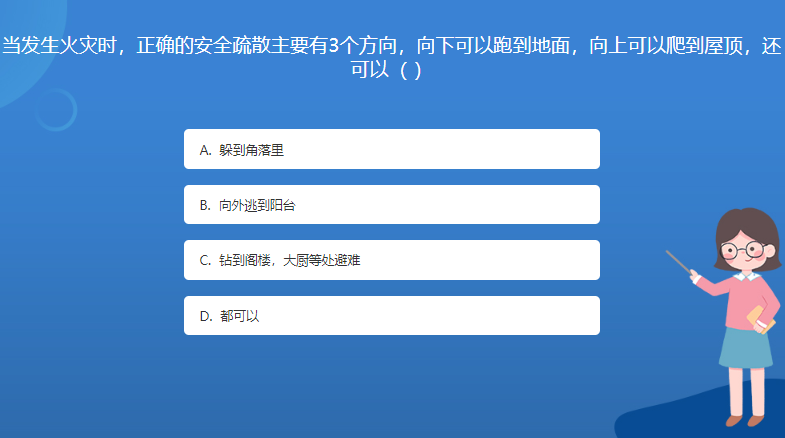 科普基地星空体育官网入口网站問答:當發生火災時,正確的安全疏散主要有3個方向,向下可以跑到地麵,向上可以爬到屋頂,還可以( )