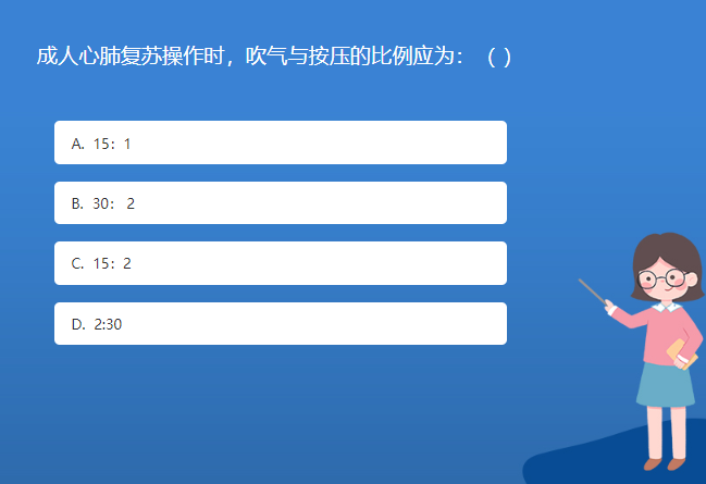 科普基地星空体育官网入口网站問答:成人心肺複蘇操作時,吹氣與按壓的比例應為:( )