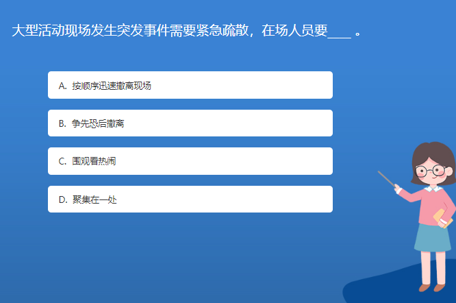 科普基地星空体育官网入口网站問答:大型活動現場發生突發事件需要緊急疏散,在場人員要____ 。