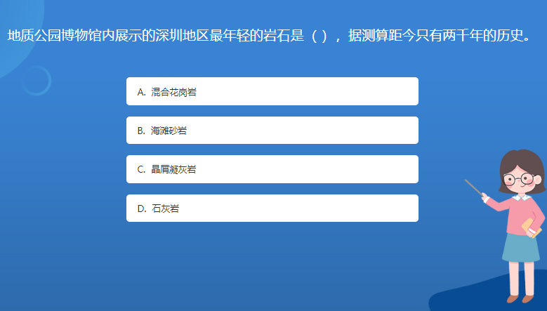 科普基地星空体育官网入口网站問答:地質公園博物館內展示的深圳地區最年輕的岩石是( ),據測算距今隻有兩千年的曆史。