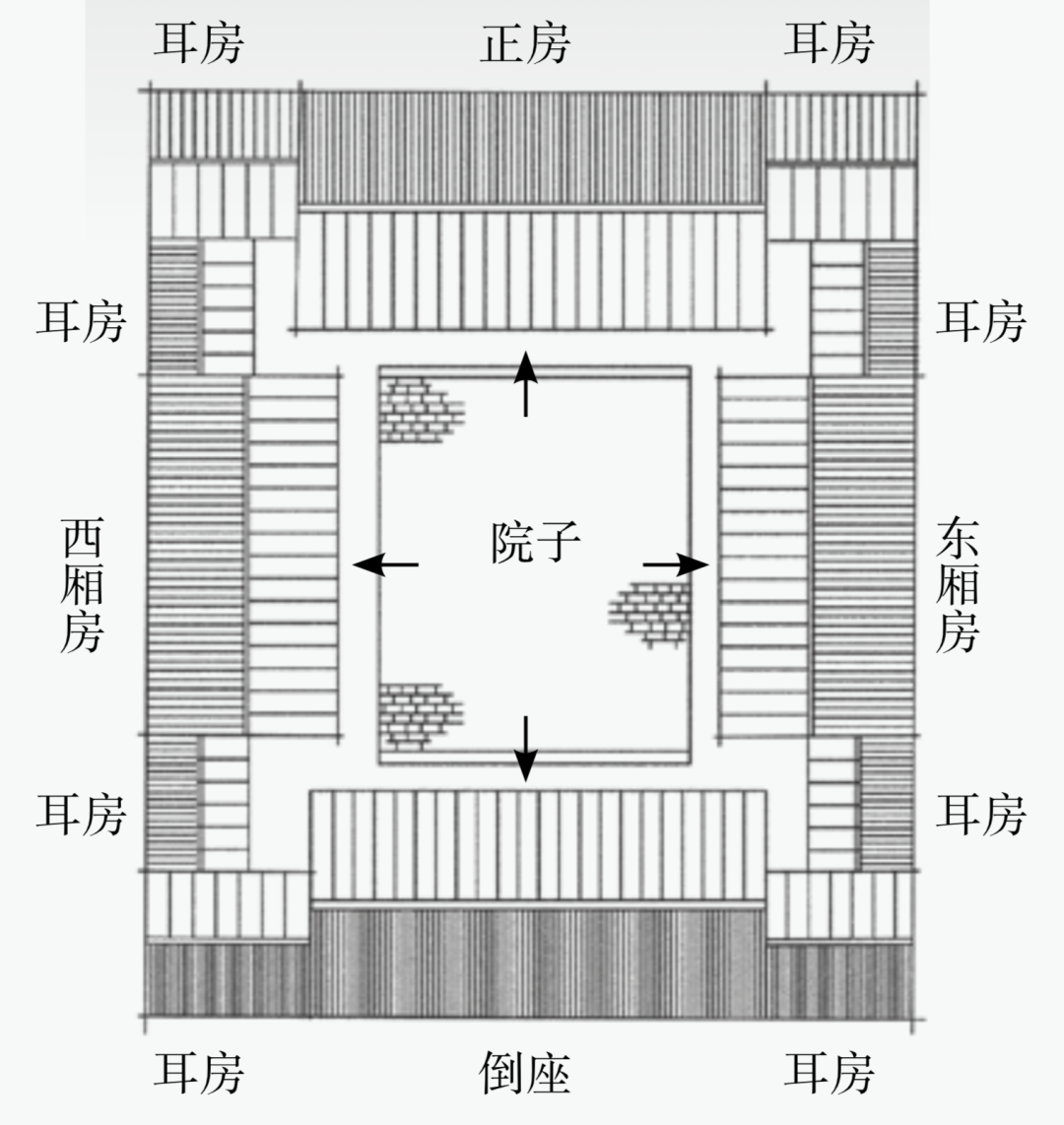它們(men) 的形製基本遵循著「四大八小」的類型,即正房、東(dong) 西廂房、與(yu) 正房相對的倒座這四處建築;「八小」為(wei) 周圍配合的八座小耳房,每大配二小。