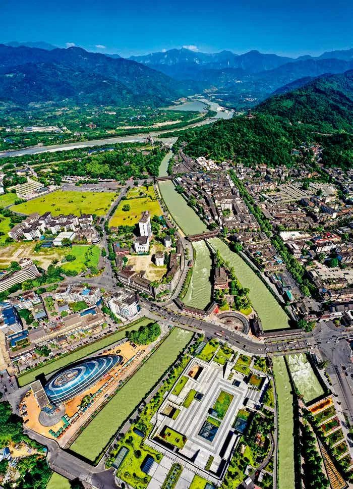 從(cong) 高空俯瞰,它們(men) 儼(yan) 然一個(ge) “川”字,潤澤了成都平原的大片土地。經過曆代發展,都江堰灌區扇麵越發擴大,如今已覆蓋了六十多萬(wan) 公頃。都江堰造就天府之國,名副其實。