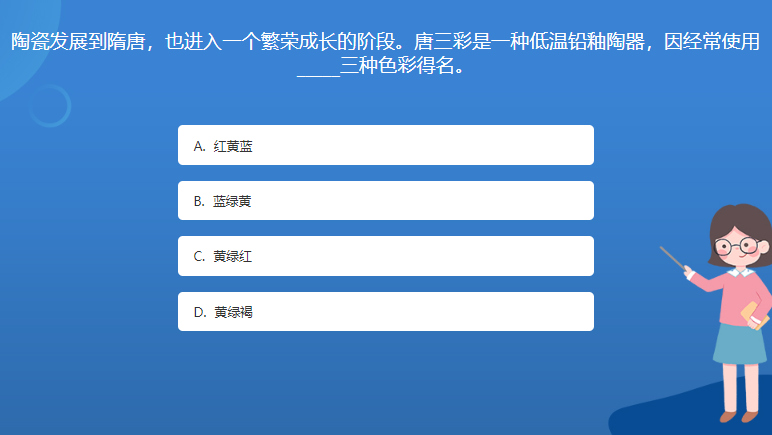 科普基地星空体育官网入口网站問答:陶瓷發展到隋唐,也進入一個繁榮成長的階段。唐三彩是一種低溫鉛釉陶器,因經常使用_____三種色彩得名。